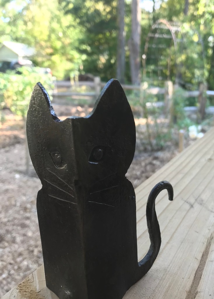 A cat made from angle iron using instructions from Torbjörn Åhman based on the art of Elizaveta Polikashina.