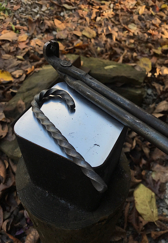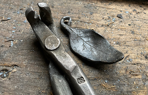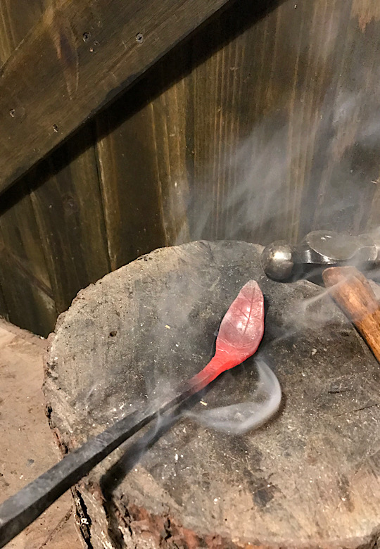 A bit of inspiration on my stump anvil. The leaf…not the tongs. I really should not leave those tongs out in the rain.