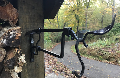 Hanging plant basket bracket. This was my first attempt at using a hot collar, which is a blacksmithing technique for connecting two pieces of metal without welding or mechanical connectors. I am going to need a bit more practice with this technique.