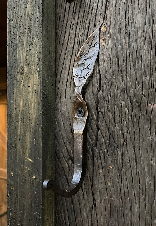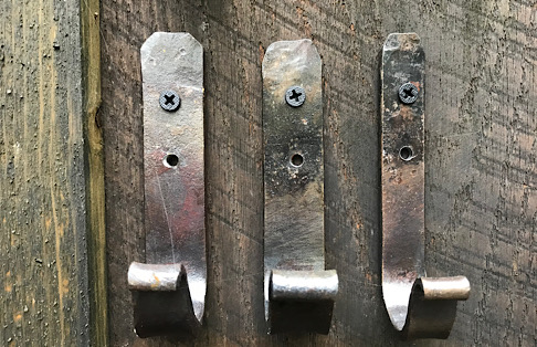 More hooks with leaves. The goldy/brassy looking finish comes from rubbing the hot metal with a bronze brush at the end of the forging process. So I guess you could say it has a bronze finish. Yeah, that is a bit more succinct than goldy/brassy finish.