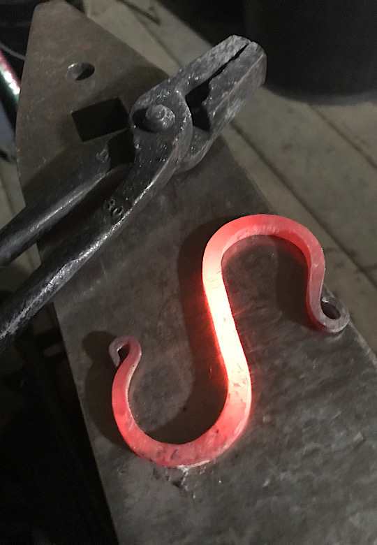 Heating a 12” S hook in charcoal before twisting.