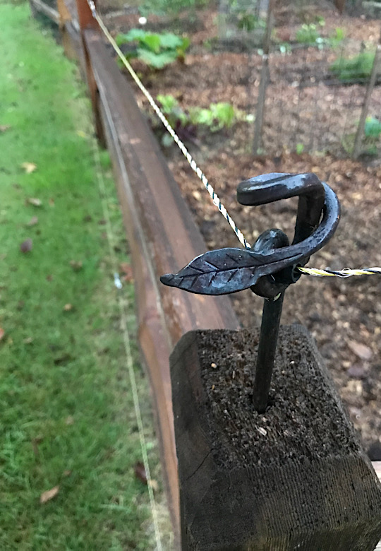 Electric fence standoff with a leaf motif.