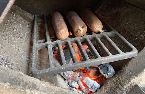 The Whitlox Wood-fired Forge is also great for cooking! In blacksmithing, it is important that your tongs fit your work properly. I just need to get Glen at GS Tongs to make me a pair of his famous bent-knee tongs that will properly fit a bratwurst.