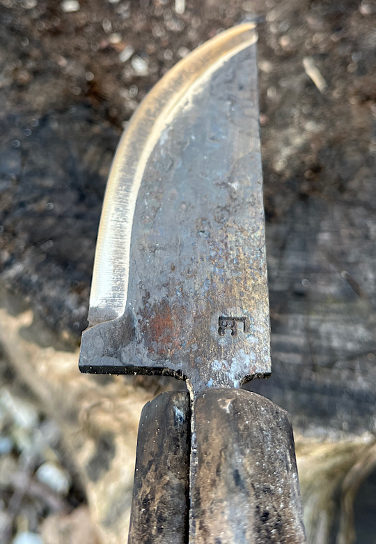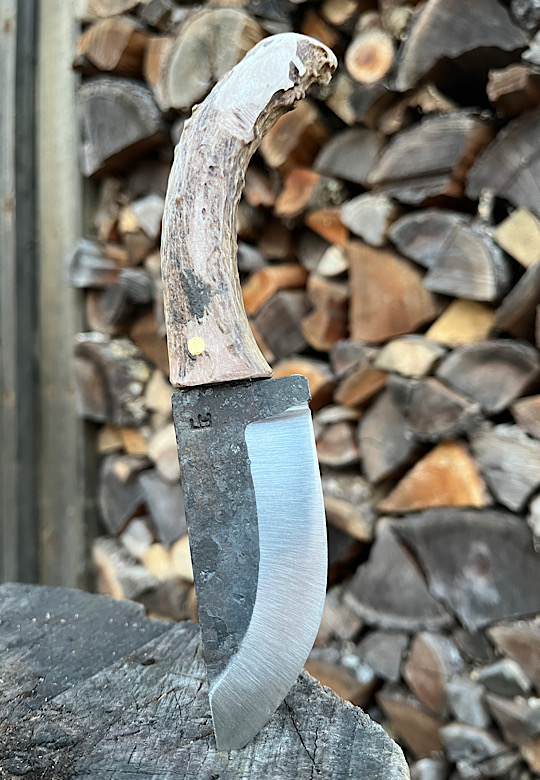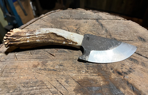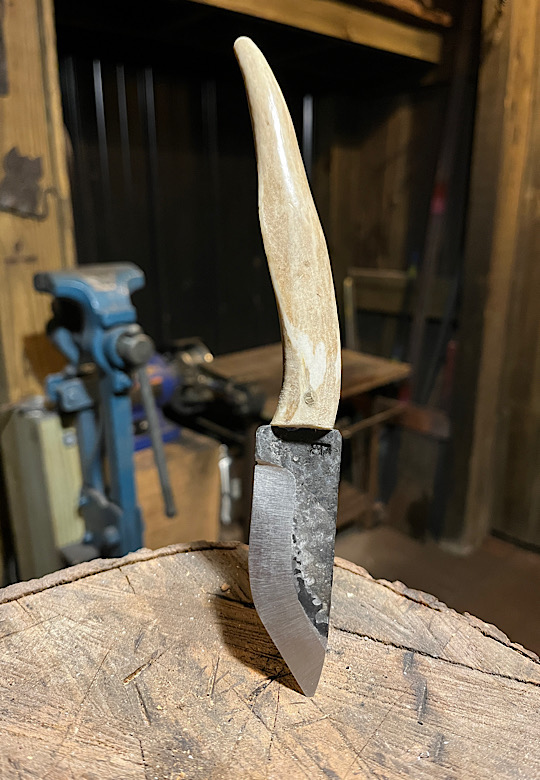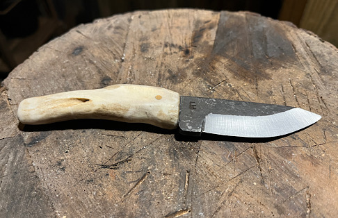A small deer antler pairing knife. Now I just have to make another one so the pair is complete.The finished product using the tine of an antler to make a small knife. I don’t know what one might use this for in particular other than cutting. Maybe reaching in to a small tight area that is far away to make a cut? Well….it was fun making it.Fitting up the tang in two small antler handled knives.A small knife with a hidden tang inside this chunk of antler.The blade for a small knife. Hardened and tempered to a golden straw color. This knife was edge quenched and tempered with the residual heat and heat from the forge.