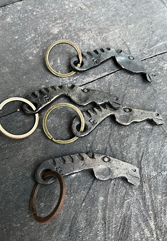 A sheep’s foot knife made using another time from a deer antler. And yes…you could use this to trim a sheep’s hooves, but that name comes from the shape of the tip.A small deer skinner…well, it can be used on any sized deer, but the knife is a small knife.Finally back to blacksmithing after completing the Airstream…well, most of it anyway. I thought I would start off with making a horse head key chain fob.The first of many horse head key chain fobs, hooks, bottle openers, and anything else that might benefit from the head of a horse..And here is the many….well…maybe a small herd of key chains. I know a few folks who might like these. You know…for thier horse ignitions and door locks. Maybe someone who has a Mustang or a Pinto. Actually, the person I know with a Pinto needs neither a door lock nor an ignition key.I finally got around to a bit of forging in 2024…and trying out my new HouseMade grinder..