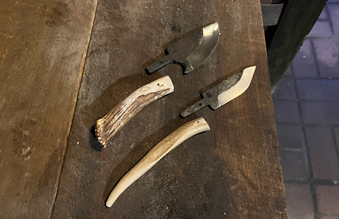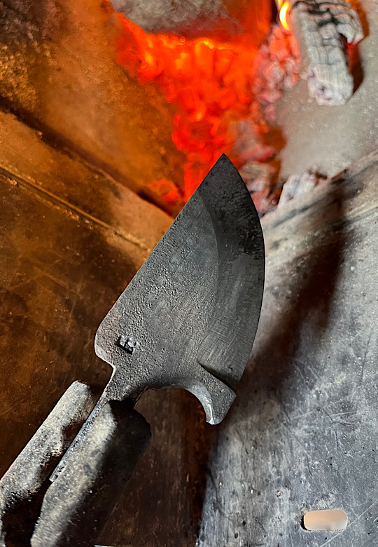 The finished product. This is just a small knife with an integral guard that could be used for cutting. Well it is a knife….of course it is used for cutting. I guess you could also defend yourself from a pirate attack…one with a very tiny sword at least.Forming the guard using the horn of my anvil.Just heating up the metal so that I can start forming the integral guard on this small knife.After taking a few months off to travel and use the Airstream, I am finally back to blacksmithing in the final weeks of 2024. I picked back up working on a few knives for folks who might enjoy them. Here is part of the heat treating process.A deer antler skinner with a slightly larger blade and handle.Another hatchet for a staff member who is leaving employment and going on to a grand adventure in Alaska. I thought this might come in handy.