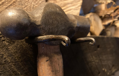 A slightly different style of fishy bottle opener forged on Christmas morning.A bit of Christmas lunch grilled on the forge.A few forged icicles.A mantle hook for hanging Christmas stockings.I thought I had better make a few more candy canes using this most excellent bending jig from Glen at GSTongs………but I may have went a bit overboard!Making a few more bottle openers.What do you do with a crappy pair of tongs? Make it into something useful, like a hook. These were bad tongs because the area where the rivet was and the transition to the jaws is too thin. This caused the tongs to bend when they were being used. Just a bad design. So be aware of details like these when you go and purchase new tongs. And I highly recommend trying a single pair before you buy a set of them…and yes I am speaking from experience. Now I have to figure out what to do with the other three pairs.A fireplace set for a departing friend with a fireplace and no poker….which is like having a, well, a fireplace with no poker. Yeah, I got nothing. Anyway, another friend at work put the broom on the handle. A bit of teamwork on this one.I thought I would try to make something new…the chopsticks not the pad thai. The pad thai was made by our Staff Cook, Sal Monella.The wall of misfit hooks continues to grow….Another successful hatchet test. Limbs everywhere…..Be wary! We are coming for you!Hatchet #2. Hatchet #1 died a spectacular death during extensive testing splitting wood, chopping trees, and de-limbing a downed tree. A small section of the forge weld was not welded and peeled back like I took a can opener to it….which is why we test out these things.First hatchet using forge welding techniques. I had been using a commercial ax to split small pieces of wood for my forge, but a hatchet will be much more useful. So, I made one.Tempering the bit after quenching. Only the bit of the ax was quenched. This cheek, eye, and poll were not quenched to keep if from getting too hard. The heat from these unquenched areas ran to the bit, tempering it to a nice straw color in the process.I used the gas forge for this to keep the forge welds cleaner. This also made the forge all nice and toasty on a 12 degree day.To create the ax head, I started with 13” of 1045 with an 4” piece welded to one end. This wound up being a bit long and I cut a bit off of the bit. Next time a 11” piece with an additional 3” welded to the end will be about right.A couple of owl hook ready to nest in someone else’s home.I tried my hammer at making a cat hook. I need to work on that a bit. I think my cat looks a bit owlish. Not sure if it is such a good idea to put a cat hook so close to a bird hook, but I think the owl can take him.I needed a straight peen hammer. I thought hey, I am a blacksmith (well, I have some blacksmith tools and a forge)…I have this old 2 lb hammer head I can reforge into a straight peen. Maybe not the best idea I have ever had. Seems to be a lot of work. I guess I will just keep pecking away at it…Converting this ball peen hammer head into a straight peen hammer for doing small fine work. Ok. I really modified this one because the 2 lb hammer was a LOT of work. This smaller hammer was much easier..Simple hook for hanging tongs and other tools.Happy New Year! First project of the new year…hammer hooks! Gotta get those hammers off the floor, anvil, dog chew toy, etc. and get them a proper home.