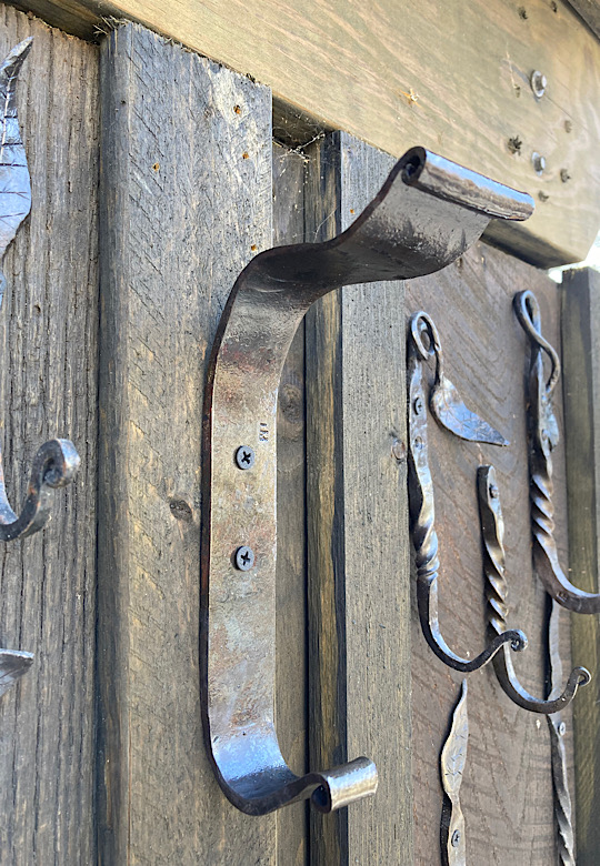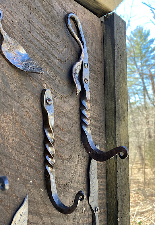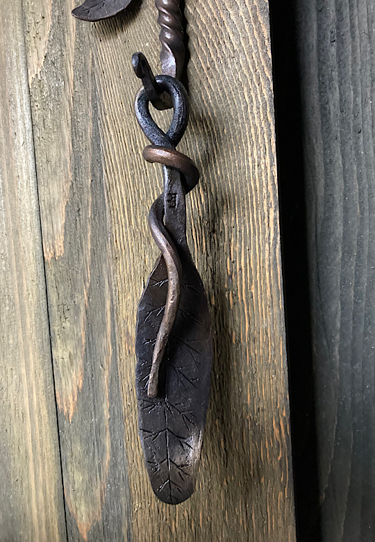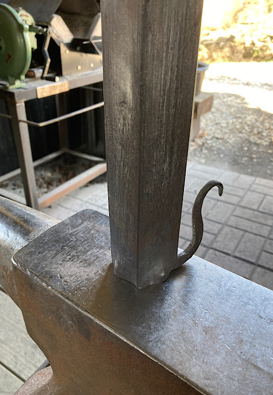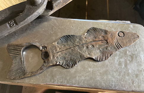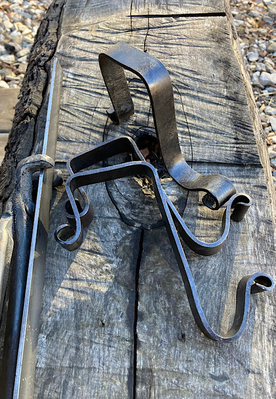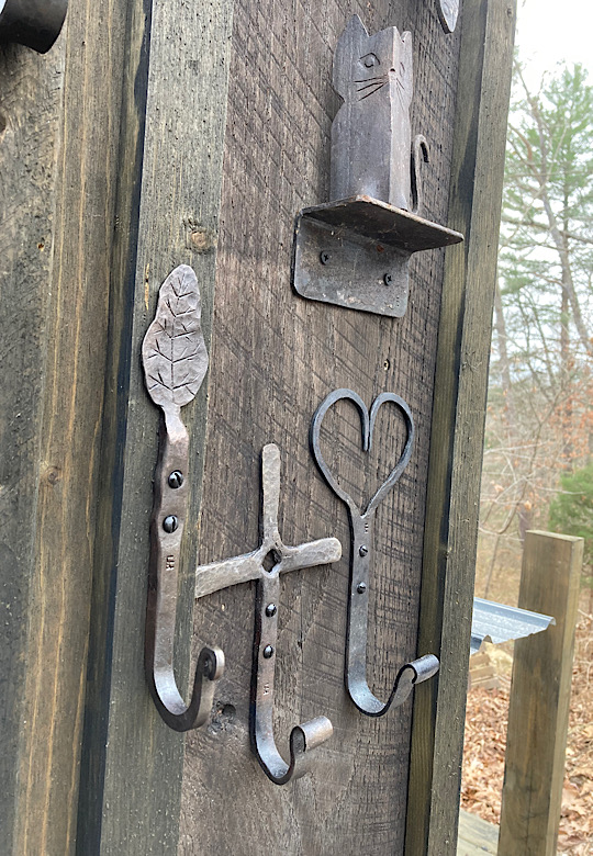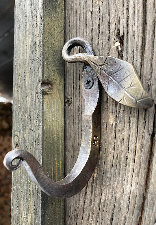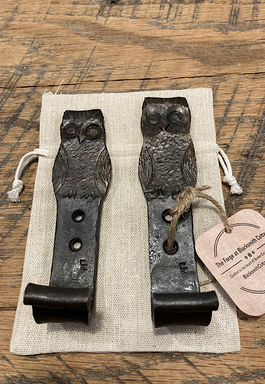 A door handle for the inside of the forge door. I did not need to worry about closing the door until now….the -7 degree temps made me decide that being able to close the door from the inside would be a good thing.I made some Christmas wreath hooks to go to Common Grounds Coffee Shop in Nashville, Indiana so the owner can hang up…well, Christmas wreaths…or I guess anything that needs to be hung on the door, including but not limited to unruly children and adults….as long as they weigh about the same as a Christmas wreath.This particular paw print is for a limited edition Uga bottle opener made from this scrap end I was about to cut off and throw away.Here are some cubicle hooks made from some scrap / off-cuts from MetalsSupermarket. This was 13” of 1/8” x 3/4” flat bar. Holding a coat or hat for folks in the office will be a great use for these small pieces of scrap.In the process of forging out a white oak leaf from a piece of scrap angle iron. Now upon first glance you might have been thinking red oak leaf, but the ends are more rounded in a white oak leaf compared to red. But I can see how one might think this is a red oak leaf because a couple of the lobes are not rounded yet….oh, and I guess it is a red color.Yet another style of hook. This one inspired by John Switzer at Black Bear Forge.Made a shoe horn for someone this weekend. i had no idea shoe horns were still a thing that people use, but after a specific age or if you can’t bend over for some other reason, shoe horns are quite useful. And I guess it is quite hard to find a high quality, hand made shoe horn any more. So if you are in need of a shoe horn…find your local blacksmith! Maybe this is what I will start making folks for their retirement gift. And It can also double as a tiny little shovel 👍Another forge cat. I think we will keep this one outside. Here is finally an outside cat guaranteed not to eat birds…well, maybe it might eat those metal owls I have been making…. The completed forge cat. Now, if it can only get rid of those forge mice. I think this cat will be useless for that.In every piece of angle iron hides a forge cat.A new cowboy hat and coat hook….not a cowboy coat, just a regular coat. I guess it could also be used for your lasso. Yep, that is what it is. Hat and lariat hook.Time to make the candy canes for Christmas….in March? Is this part of March Madness, or maybe Christmas in March? No. These are for our visitors to Nashville, because buying a Christmas ornament while on vacation is a thing. These will be available for sale in a local shop.Back to the basics. A simple leaf hook. For holding leaves of many shapes….as well as a bunch of other stuff, like hats, shirts, and dog leashes. Really, anything you might want to hang up.First item…coyote print bottle openers. 5” down, 55” to go. Or, I can have 1 bottle opener that will open any bottle down the length of a bar. Maybe I will make a couple more of the short version.I got this bar of 1/2” x 1 1/4” steel from the local steel shop because they have a lot of these pieces left over from a big job. Now what the heck am I going to make out of this. I really have to watch those impulse buys.A pair of GS-style bent knee tongs made at the historical (or hysterical) Forge at Blacksmith Cottage. These are a shameless copy of the tongs made by master tongsmith Glen (the hot steel hustler) Stollmeyer. If you would like to purchase a set of tongs like this that look a whole lot better, Glen’s website is GSTongs.com. I have several pairs of Glen’s tongs and the are pretty great.Another view of my new tongs. These are my first tongs made from scratch. They took me about 4 hours to make so I am going to show them off with multiple photos. This shape not only lends them to picking up hot steel anywhere along the length, but they also lend themselves to scratching one’s back, assuming you let them cool off first.The double owl hook. Perfect for hanging cloaks, pointy hats, or even wands.Screech owl close-up from double owl hook.