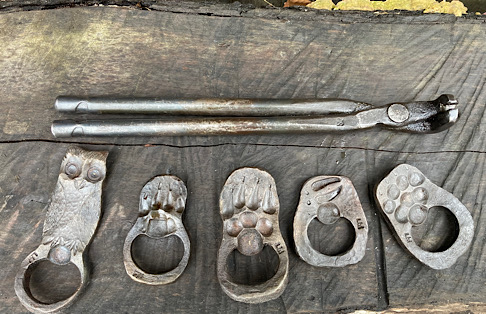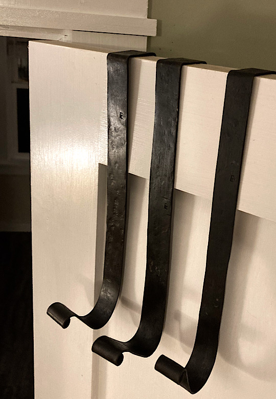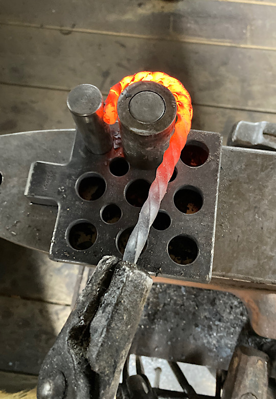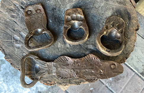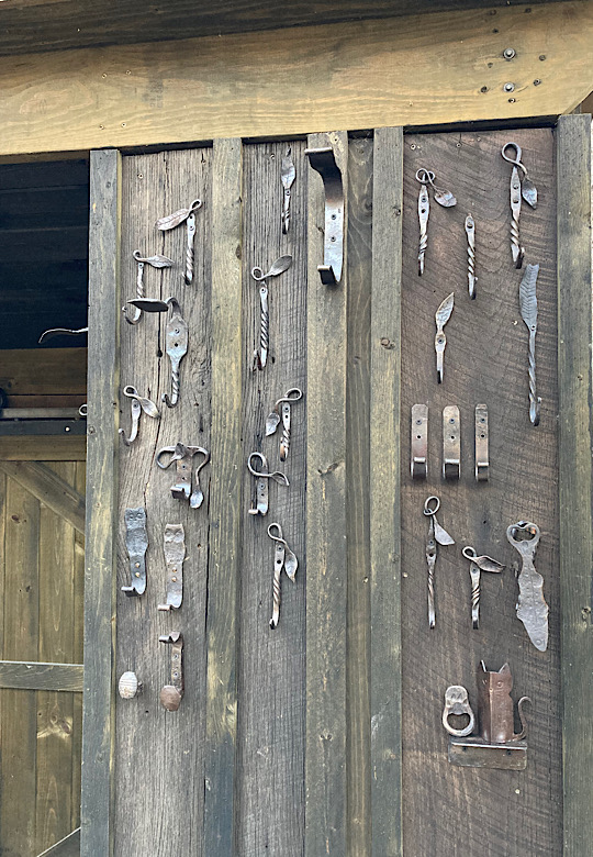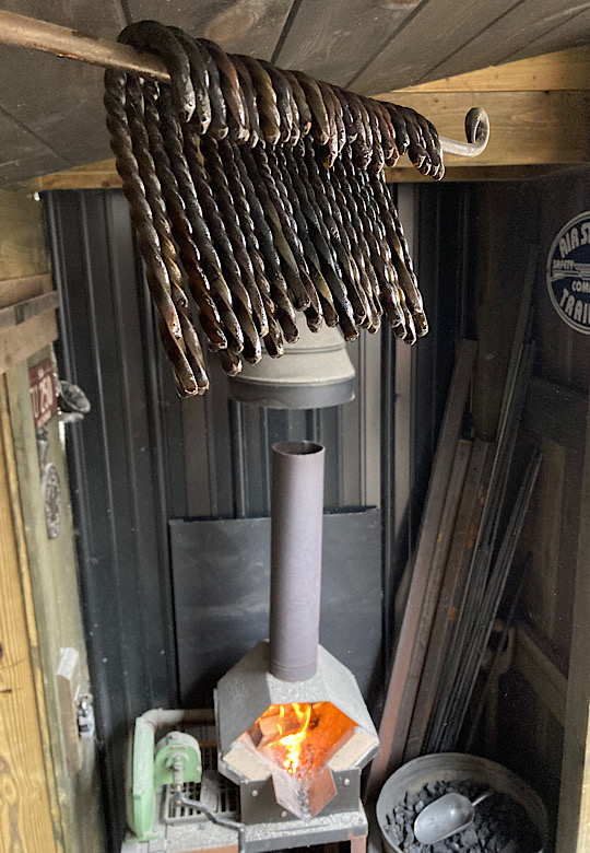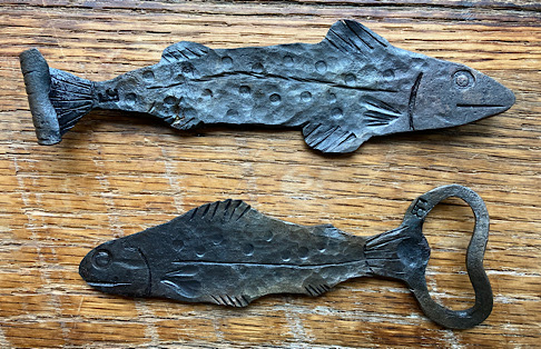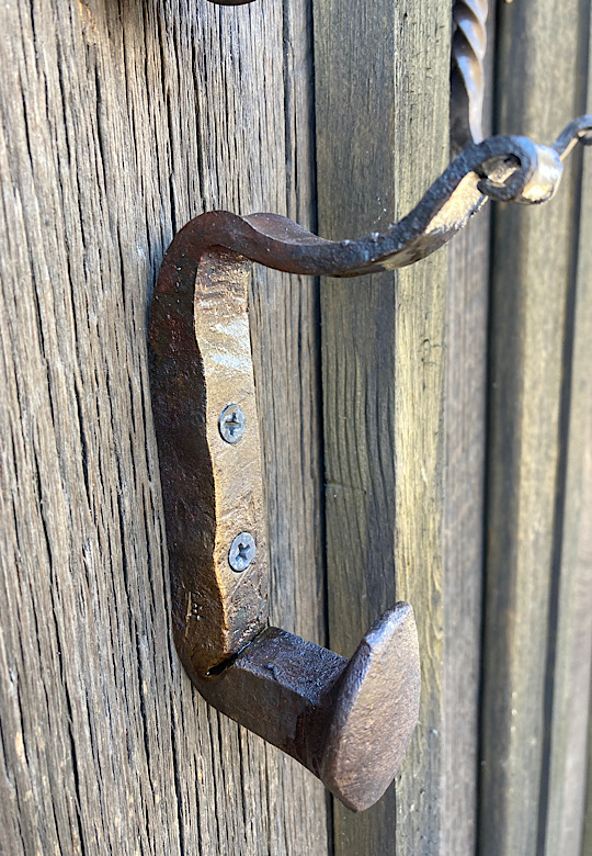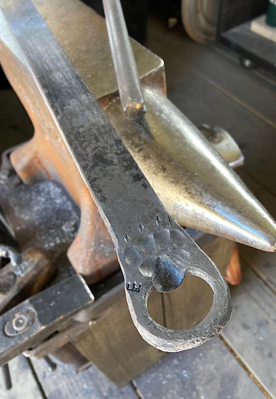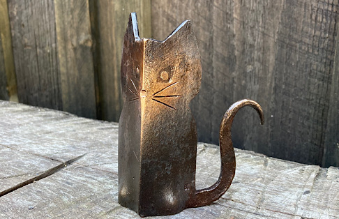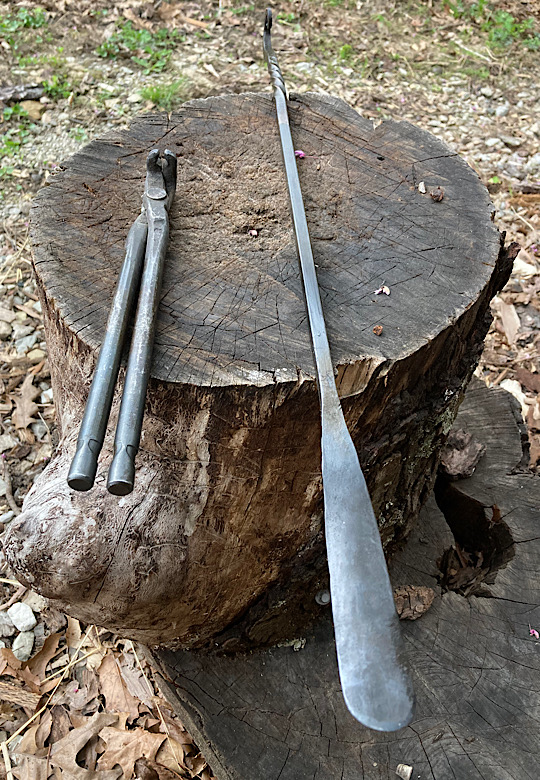 A door handle for the inside of the forge door. I did not need to worry about closing the door until now….the -7 degree temps made me decide that being able to close the door from the inside would be a good thing.I made some Christmas wreath hooks to go to Common Grounds Coffee Shop in Nashville, Indiana so the owner can hang up…well, Christmas wreaths…or I guess anything that needs to be hung on the door, including but not limited to unruly children and adults….as long as they weigh about the same as a Christmas wreath.This particular paw print is for a limited edition Uga bottle opener made from this scrap end I was about to cut off and throw away.Here are some cubicle hooks made from some scrap / off-cuts from MetalsSupermarket. This was 13” of 1/8” x 3/4” flat bar. Holding a coat or hat for folks in the office will be a great use for these small pieces of scrap.In the process of forging out a white oak leaf from a piece of scrap angle iron. Now upon first glance you might have been thinking red oak leaf, but the ends are more rounded in a white oak leaf compared to red. But I can see how one might think this is a red oak leaf because a couple of the lobes are not rounded yet….oh, and I guess it is a red color.Yet another style of hook. This one inspired by John Switzer at Black Bear Forge.Made a shoe horn for someone this weekend. i had no idea shoe horns were still a thing that people use, but after a specific age or if you can’t bend over for some other reason, shoe horns are quite useful. And I guess it is quite hard to find a high quality, hand made shoe horn any more. So if you are in need of a shoe horn…find your local blacksmith! Maybe this is what I will start making folks for their retirement gift. And It can also double as a tiny little shovel 👍Another forge cat. I think we will keep this one outside. Here is finally an outside cat guaranteed not to eat birds…well, maybe it might eat those metal owls I have been making…. The completed forge cat. Now, if it can only get rid of those forge mice. I think this cat will be useless for that.In every piece of angle iron hides a forge cat.A new cowboy hat and coat hook….not a cowboy coat, just a regular coat. I guess it could also be used for your lasso. Yep, that is what it is. Hat and lariat hook.Time to make the candy canes for Christmas….in March? Is this part of March Madness, or maybe Christmas in March? No. These are for our visitors to Nashville, because buying a Christmas ornament while on vacation is a thing. These will be available for sale in a local shop.Back to the basics. A simple leaf hook. For holding leaves of many shapes….as well as a bunch of other stuff, like hats, shirts, and dog leashes. Really, anything you might want to hang up.First item…coyote print bottle openers. 5” down, 55” to go. Or, I can have 1 bottle opener that will open any bottle down the length of a bar. Maybe I will make a couple more of the short version.I got this bar of 1/2” x 1 1/4” steel from the local steel shop because they have a lot of these pieces left over from a big job. Now what the heck am I going to make out of this. I really have to watch those impulse buys.A pair of GS-style bent knee tongs made at the historical (or hysterical) Forge at Blacksmith Cottage. These are a shameless copy of the tongs made by master tongsmith Glen (the hot steel hustler) Stollmeyer. If you would like to purchase a set of tongs like this that look a whole lot better, Glen’s website is GSTongs.com. I have several pairs of Glen’s tongs and the are pretty great.Another view of my new tongs. These are my first tongs made from scratch. They took me about 4 hours to make so I am going to show them off with multiple photos. This shape not only lends them to picking up hot steel anywhere along the length, but they also lend themselves to scratching one’s back, assuming you let them cool off first.The double owl hook. Perfect for hanging cloaks, pointy hats, or even wands.Screech owl close-up from double owl hook.